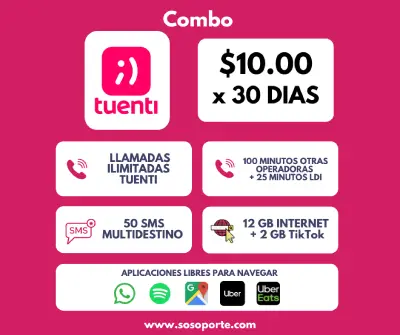 12GB + 100 Min Llamadas ilimitadas entre tuentis + 25 Min LDI + 50 SMS + Gratis WhatsApp y Spotify + Navega gratis (Google Maps, Uber eats, Uber) x 30 días
